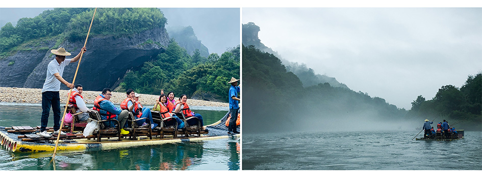 晨光熹微,大家有幸坐上了竹筏,沿?九曲溪?漂流而下。清溪如帶,奇峰倒影,艄公的幽默講解讓大王峰、玉女峰的傳說更添生動(dòng)。